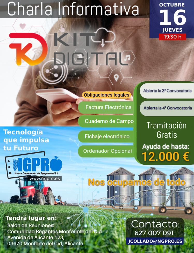 Le invitamos a asistir a la Charla informativa que se celebrará el jueves 16 de octubre a las 19:30h en el salón de reuniones de la Comunidad de Regantes de Monforte del Cid sobre el KIT DIGITAL para las nuevas…
